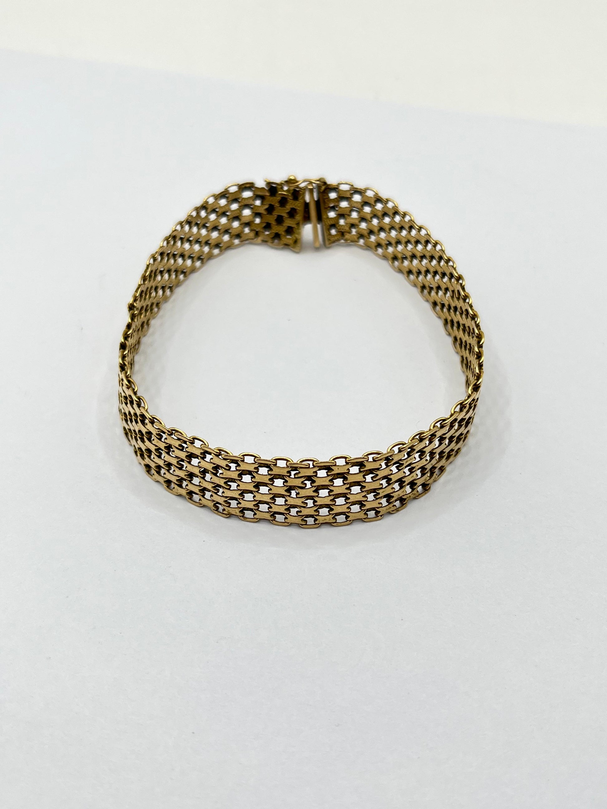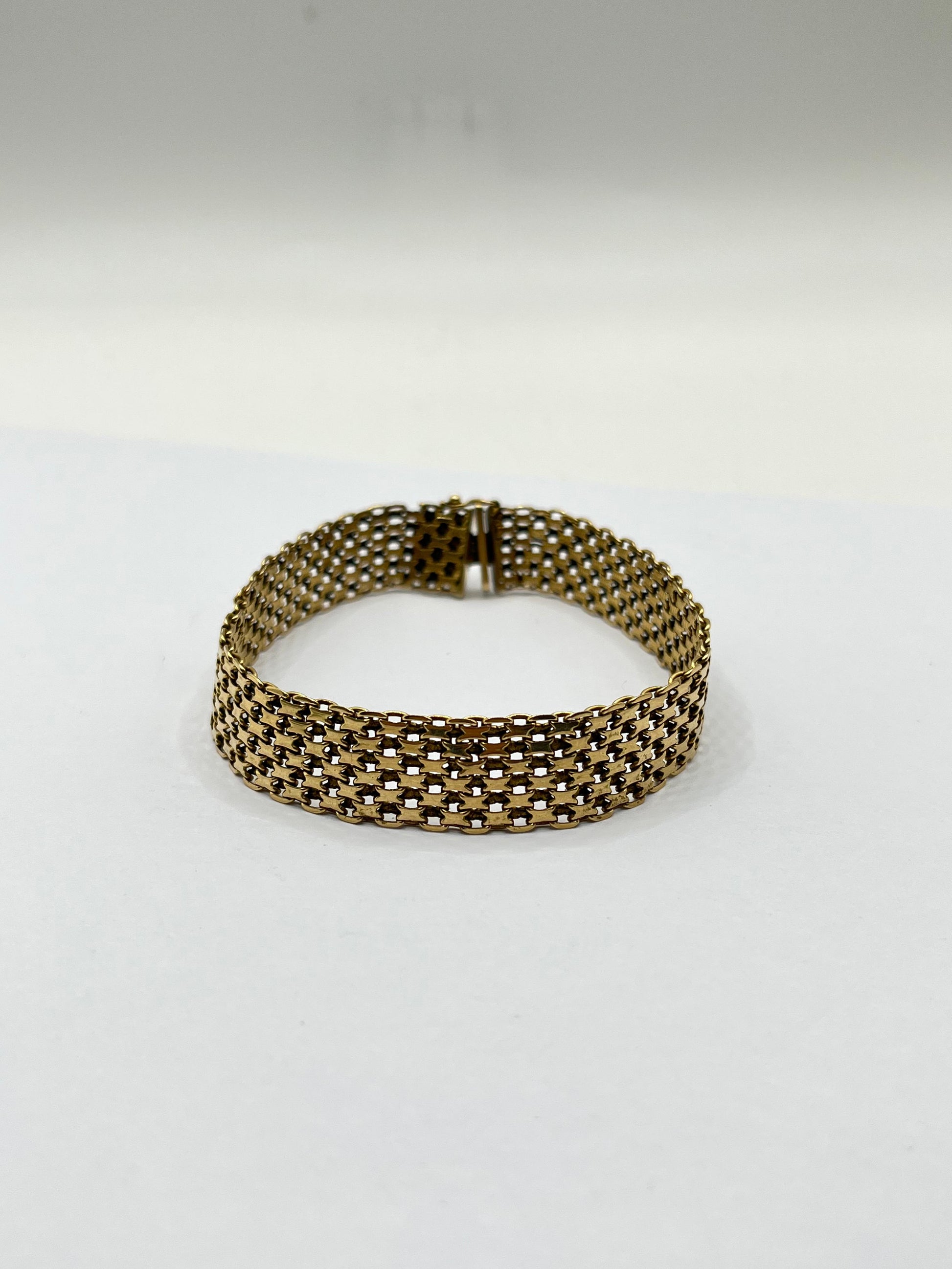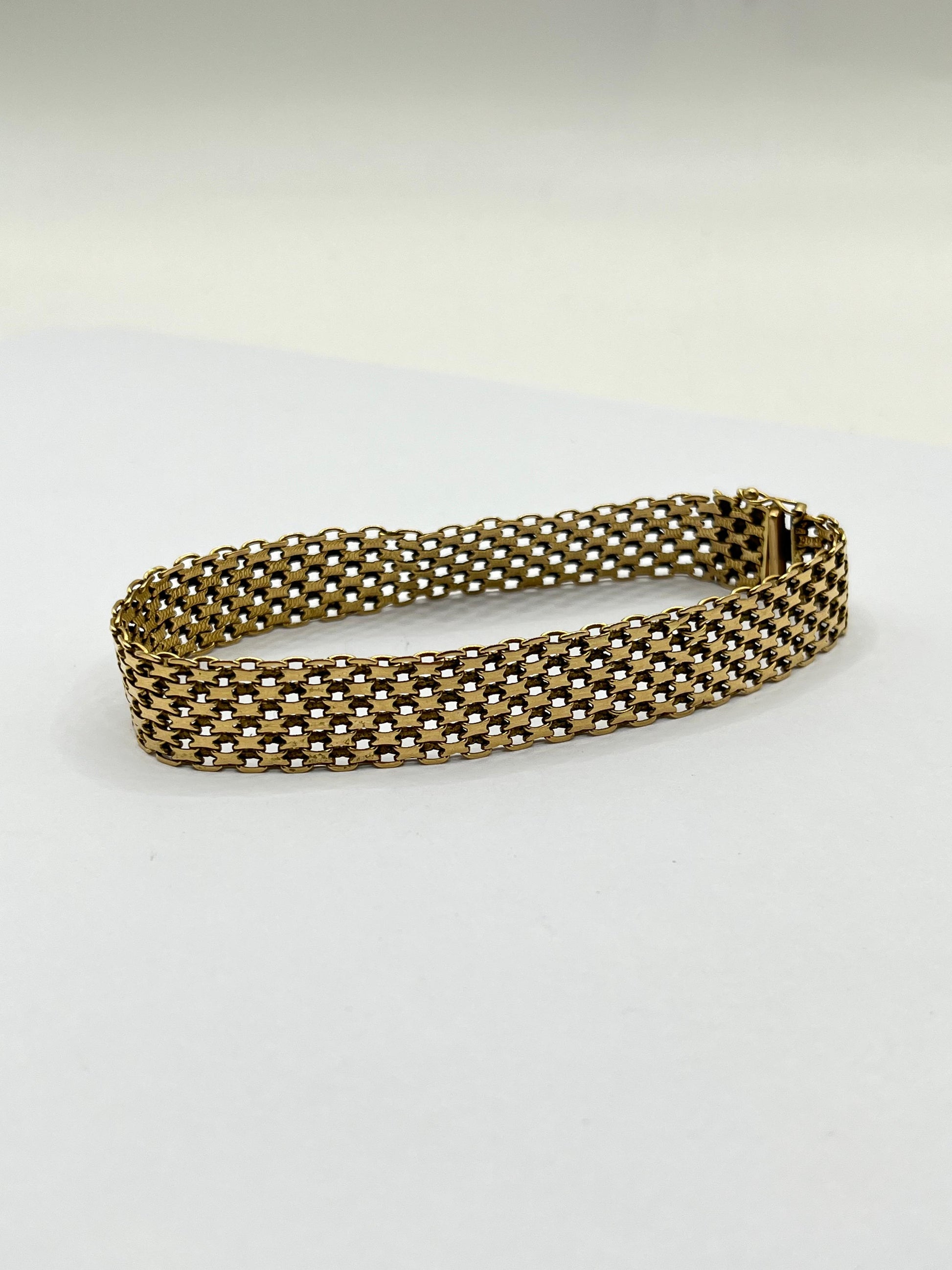 Elegante brazalete de oro amarillo de 14 quilates, con diseño tipo malla o tejido plano que le otorga flexibilidad y sofisticación. Ideal para lucir solo o acompañado de otros accesorios.