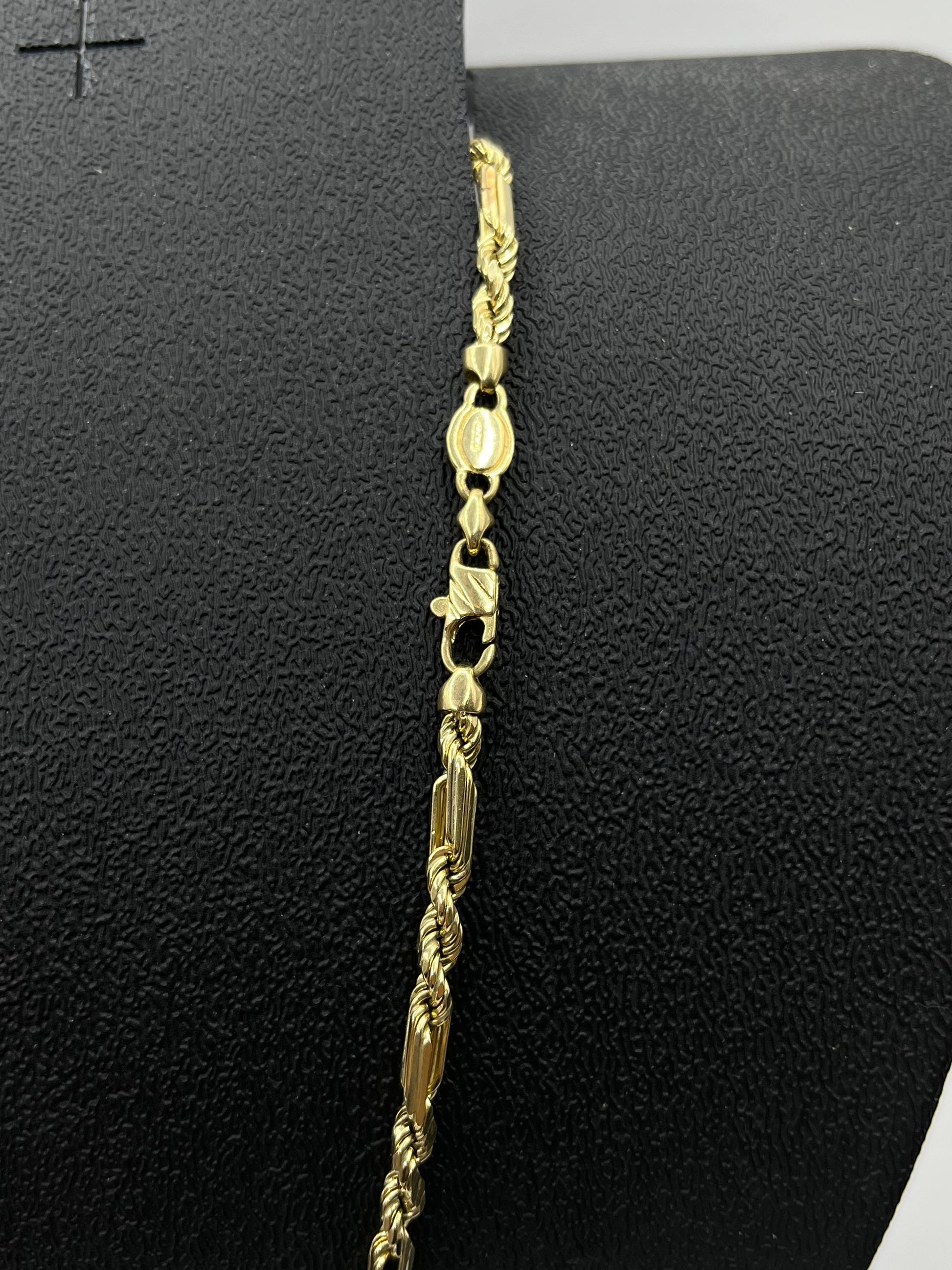 Cadena de oro amarillo de 10 quilates con diseño estilo torsal Figaro, acompañada de un elegante dije de la Virgen. Su combinación de eslabones torsal con detalles tipo Figaro aporta un equilibrio perfecto entre elegancia y devoción. Ideal para uso diario o como pieza significativa de colección.