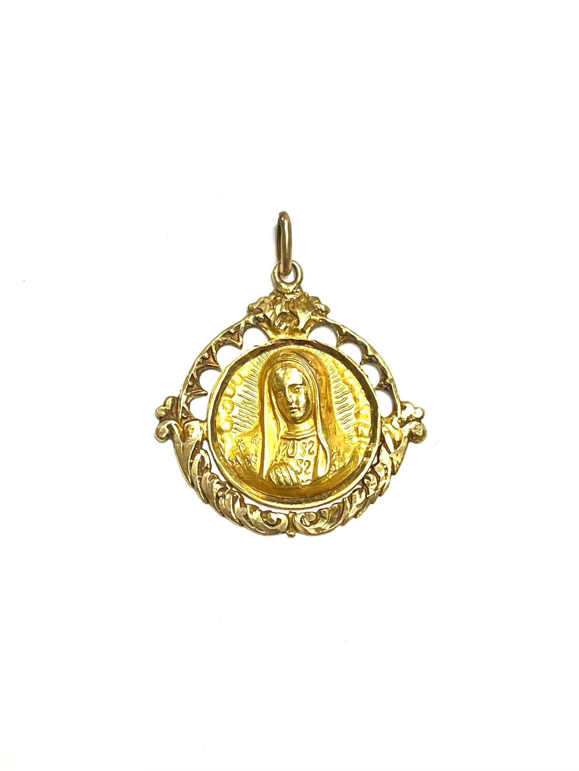 Elegante dije vintage de la Virgen en oro de 10k, con un peso de 2.9 gramos y 3cm de altura. Una pieza con encanto tradicional que combina fe y estilo, perfecta para llevar contigo o regalar a alguien especial. Su diseño atemporal complementa cualquier atuendo.