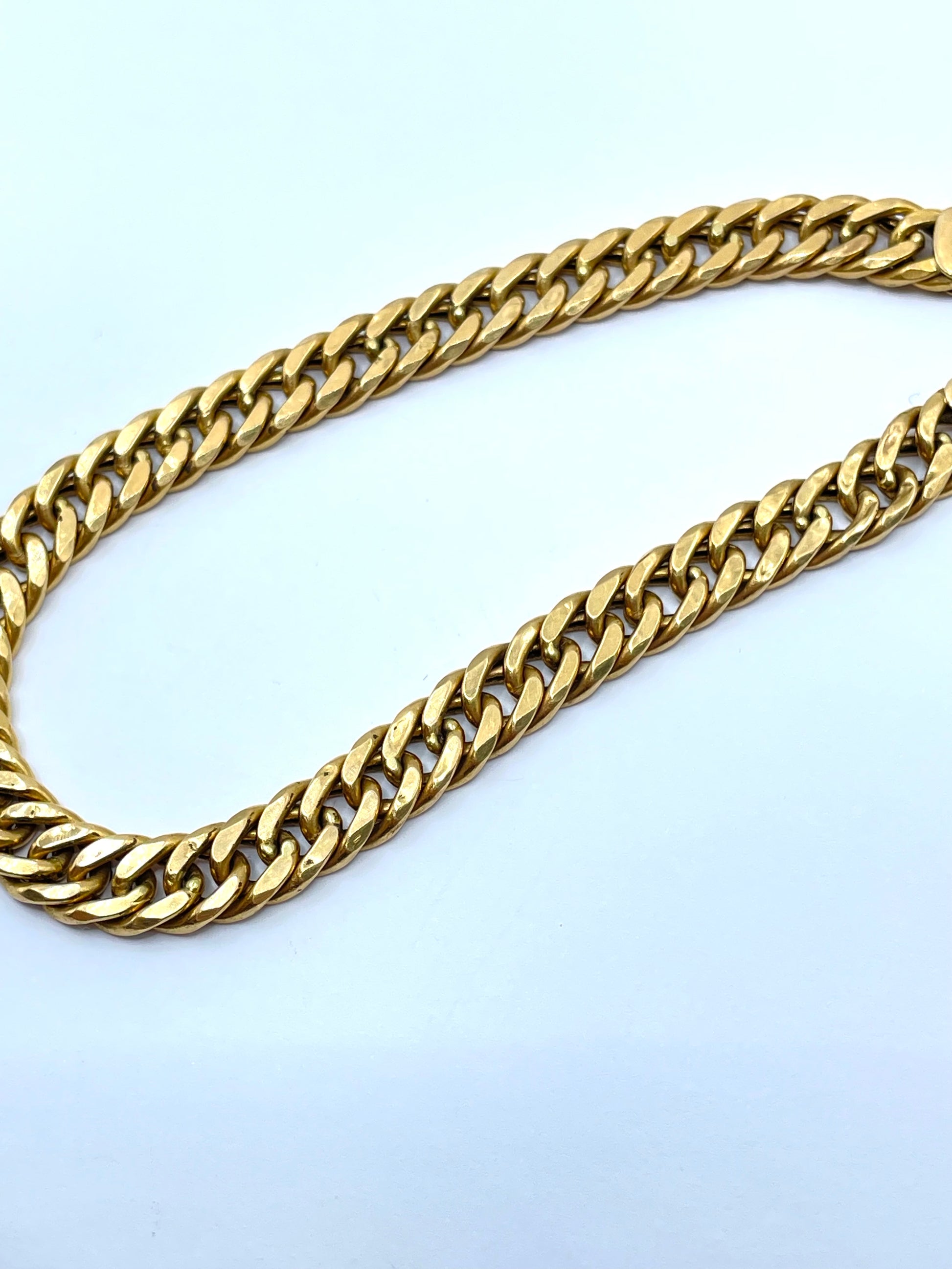 Imponente pulsera de oro puro de 21 kilates, diseñada con eslabones estilo cubano, reconocidos por su firmeza, elegancia y carácter. Su acabado brillante y su estructura robusta hacen de esta pieza una joya ideal tanto para hombres como para mujeres que buscan estilo y distinción. Con un peso de 12.8 gramos, esta pulsera no solo destaca por su apariencia, sino también por su valor como inversión.